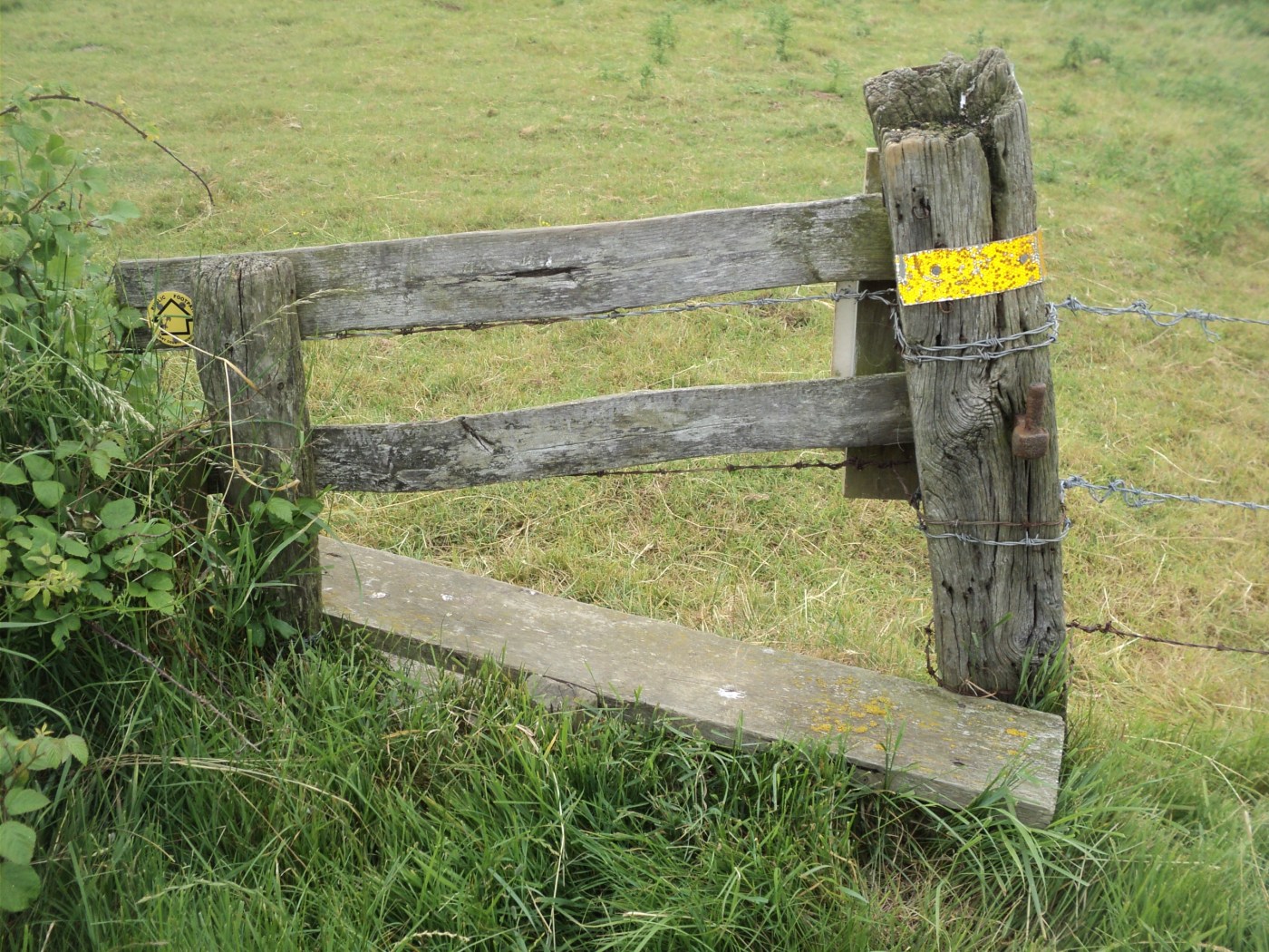 This complete eyesore is a hideous mess of a stile, and yet another demonstration of the hostility and cynicism shown by land owners when it comes to their begrudging unwillingness to observe their covenants with regards to the public rights of way that exist over their land. The haphazard design is offensive to the eyes and a horrible creation to navigate, and to add even more insult to injury, there are not one, but two exposed lines of barbed wire.